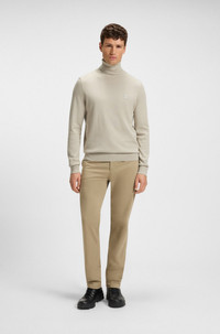 SIZE AND FIT The model wears a size M and is 6'1" tall with a, 32" chest, 25" waist and 35" hips. DETAILS Akiro_S - 50527573 A soft and breathable rollneck sweater by BOSS. This regular-fit piece is blended with cashmere and trimmed with a woven logo label. Regular fit Neckline: Turtleneck Long sleeves Standard length QUALITY & CARE INSTRUCTIONS Cold, gentle machine wash; reduced spin speed. Do Not Tumble Dry Iron Low Heat Do Not Bleach Dry Clean Only Quality: 95% Cotton, 5% Cashmere