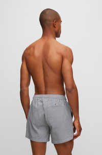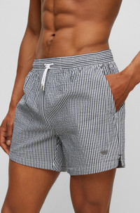 SIZE AND FIT The model wears a size M and is 6'2" tall with a, 38" chest, 29" waist and 36" hips. DETAILS Velvetfish - 50469322 Contemporary swim shorts by BOSS. Patterned with a vertical stripe on stretch seersucker for a modern look, these fully lined shorts are detailed with a BOSS logo badge on the left leg. The rear pocket is accented with a signature-stripe trim. Semi-elastic waistband Drawstring Pockets bottom front: Side slash pockets Pockets bottom back: Welt pocket Medium length QUALITY & CARE INSTRUCTIONS Do Not Tumble Dry Quality: 55% Polyamid, 45% Polyester, Lining: 100% Polyester Machine Wash Cold Do Not Bleach Do Not Iron Do Not Dry Clean