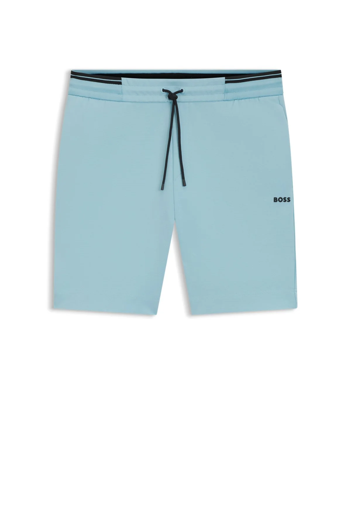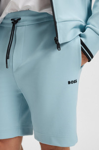 SIZE AND FIT The model wears a size M and is 6'0" tall with a, 38" chest, 29" waist and 38" hips. DETAILS Shorts Zone - 50543091 With stripe details on the drawstring waistband, these straight-fit BOSS Menswear shorts make a great casual building block. Stretchy cotton blend. Molded logo. Regular fit Regular rise Drawstring Pockets bottom front: Side pockets Pockets bottom back: Welt pocket QUALITY & CARE INSTRUCTIONS Quality: 62% Cotton, 33% Polyester, 5% Elastane, pocketing: 100% Polyester Machine Wash Cold Gentle Do Not Dry Clean Do Not Tumble Dry Do Not Bleach Iron Low Heat