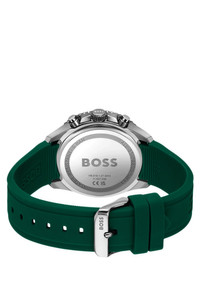 DETAILS RUNNER - 58244936 Inspired by a bold diving aesthetic, this BOSS Menswear watch features a rotating bezel with an aluminum insert. Green logo strap. Sunray-brushed black dial. Watch mechanism: Chronograph Dial color: Black Strap material: Silicone Closure: BOSS buckle Case size: 1.69 in (43 mm) (0 inches) Water Resistance (in ATM): 5 ATM QUALITY & CARE INSTRUCTIONS Quality: 80% Stainless steel, 20% Silicone