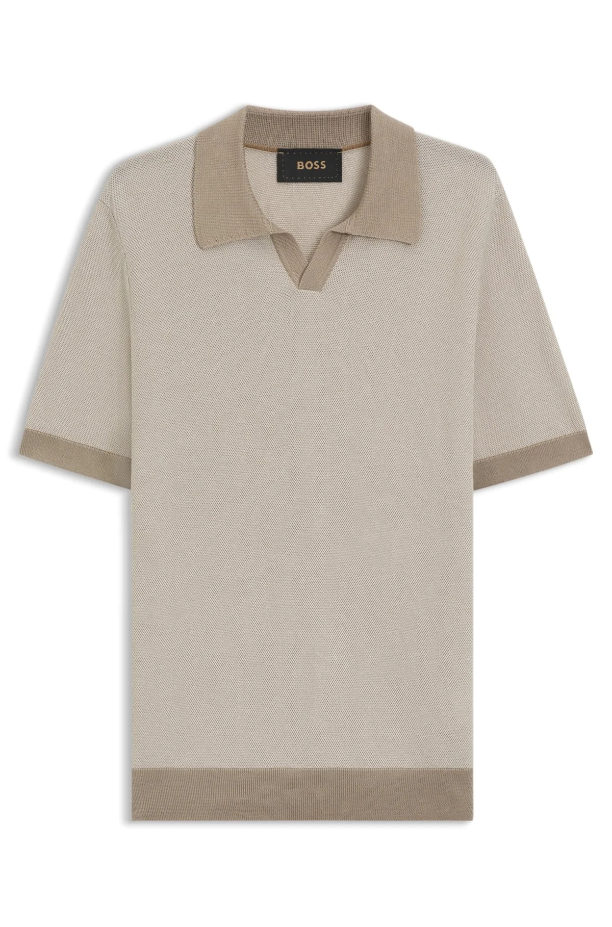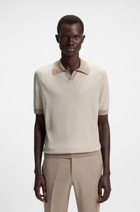 SIZE AND FIT The model wears a size M and is 6'1" tall with a, 33" chest, 31" waist and 33" hips. DETAILS A short-sleeved sweater in a micro-structured silk-cotton blend by BOSS Menswear. This regular-fit piece features an open Johnny collar. Regular fit Neckline: Polo collar Short sleeves Standard length L-Distratto - 50519587 QUALITY & CARE INSTRUCTIONS Do Not Tumble Dry Do Not Bleach Reduced Dry Clean Iron Medium Heat Cold, gentle machine wash; reduced spin speed. Quality: 55% Silk, 45% Cotton, Ribbing: 100% Silk