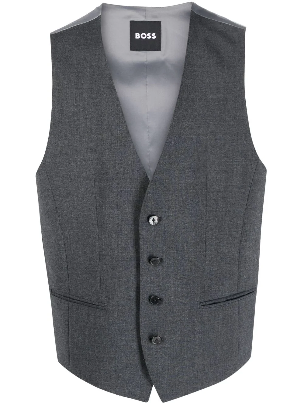 single-breasted buttoned waistcoat Highlights - Dark grey - Virgin wool blend - Satin finish - Plunging v-neck - Sleeveless - Front button fastening - Two front jetted pockets - Adjustable strap to the rear Imported Composition Outer: Virgin Wool 74%, Polyester 22%, Elastane 4% Lining: Polyester 95%, Elastane 5% SIZE & FIT Model measurements Height 6 ft 0 in(1.84 m) Bust/Chest 36.22 in(92 cm) Hips 35.43 in(90 cm) Waist 26.77 in(68 cm) FittingInformation Designed for a slim fit, offering a comfortable fit that sits just away from the body The adjustable tabs allow for fitted preferences Made from a midweight stretch fabric, this piece offers elasticity and flexibility when worn This piece fits true to size – take your usual size