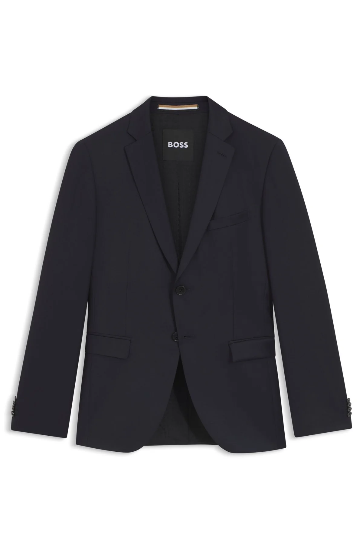 SIZE AND FIT The model wears a size EU:94 and is 6'1" tall with a, 33" chest, 24" waist and 36" hips. DETAILS H-Reymond-B1 - 50469181 A single-breasted jacket by BOSS Menswear. Fully lined for comfort, this jacket is woven with a serge technique for adaptable styling throughout the week. For our RESPONSIBLE products, we always use at least 60% more sustainable raw materials. This garment is made from at least 60% responsible and certified wool. At HUGO BOSS, responsible wool means it meets the standards of the Five Freedoms of animal welfare. Extra-slim fit Notched lapels Number of buttons: 2 Welt chest pockets Pockets top: Flap pockets Inside welt pockets Kissing buttons on the cuff Side vent Fully lined QUALITY & CARE INSTRUCTIONS Do Not Tumble Dry Do Not Bleach Quality: 100% Virgin wool, Lining: 65% Viscose, 35% Polyester, Sleeve lining: 100% Viscose, pocketing: 100% Cotton Do Not Wash Iron Low Heat Reduced Dry Clean