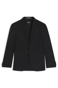 SIZE AND FIT The model wears a size 38R and is 6'2" tall with a, 37" chest, 33" waist and 35" hips. DETAILS H-Huge-B1 - 50469171 This BOSS Menswear suit jacket brings timeless elegance, with its serge weave in virgin wool and constructed shoulders. Slim fit with natural stretch for ease. Slim fit Notched lapels Number of buttons: 2 Welt chest pockets Pockets top: Flap pockets Inside welt pockets Kissing buttons on the cuff Side vent Fully lined QUALITY & CARE INSTRUCTIONS Iron Low Heat Do Not Wash Quality: 100% Virgin wool, Lining: 65% Viscose, 35% Polyester, Sleeve lining: 100% Viscose, pocketing: 100% Cotton Reduced Dry Clean Do Not Bleach Do Not Tumble Dry