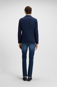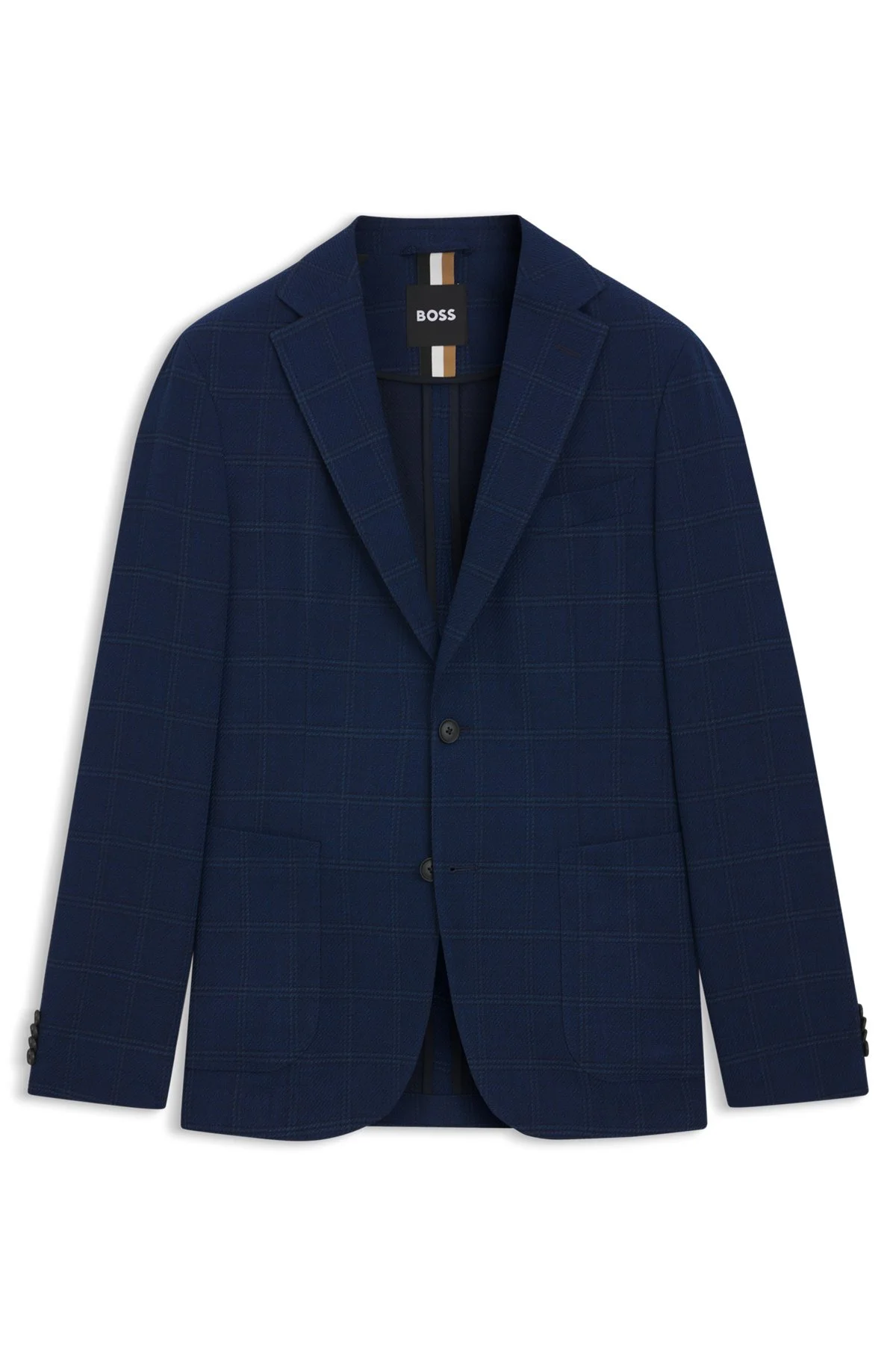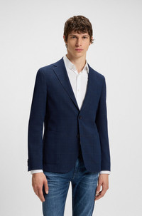 SIZE AND FIT The model wears a size 38R and is 6'2" tall with a, 37" chest, 29" waist and 37" hips. DETAILS C-Hanry-252 - 50545840 A versatile formal classic, this slim BOSS Menswear suit jacket has a timeless check. Half lined with a soft shoulder. Blended with wool, cotton and stretch. Slim fit Notched lapels Fastening top: Button closure Number of buttons: 2 Welt chest pockets Pockets top: Patch pockets Kissing buttons on the cuff Unlined QUALITY & CARE INSTRUCTIONS Do Not Tumble Dry Reduced Dry Clean Quality: 26% Viscose, 46% Virgin wool, 26% Cotton, 2% Elastane, Lining: 65% Polyester, 35% Cotton, Sleeve lining: 100% Viscose, pocketing: 100% Cotton Iron Low Heat Do Not Wash Do Not Bleach