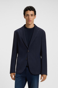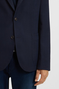SIZE AND FIT The model wears a size 40R and is 6'1" tall with a, 32" chest, 28" waist and 34" hips. DETAILS C-Hanry-252 - 50545830 With a soft shoulder construction, this slim-fit BOSS Menswear blazer is a great all-rounder. Blended with wool, cotton and stretch. Subtle pattern. Unlined QUALITY & CARE INSTRUCTIONS Do Not Tumble Dry Do Not Bleach Quality: 26% Viscose, 46% Virgin wool, 26% Cotton, 2% Elastane, Lining: 65% Polyester, 35% Cotton, Sleeve lining: 100% Viscose, pocketing: 100% Cotton Do Not Wash Reduced Dry Clean Iron Low Heat