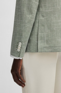 SIZE AND FIT The model wears a size 38R and is 6'1" tall with a, 33" chest, 31" waist and 33" hips. DETAILS C-Hanry-252 - 50540742 Blended with virgin wool, cotton and linen, this micro-patterned BOSS Menswear blazer is a characterful formal option. The slim fit features softly constructed shoulders. Unlined QUALITY & CARE INSTRUCTIONS Reduced Dry Clean Do Not Bleach Do Not Tumble Dry Do Not Wash Iron Low Heat Quality: 38% Virgin wool, 30% Cotton, 25% Viscose, 7% Linen, Lining: 65% Polyester, 35% Cotton, Sleeve lining: 100% Viscose, pocketing: 100% Cotton