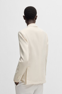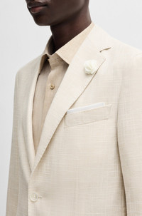 SIZE AND FIT The model wears a size 38R and is 6'1" tall with a, 33" chest, 31" waist and 33" hips. DETAILS C-Hanry-252 - 50540742 Blended with virgin wool, cotton and linen, this micro-patterned BOSS Menswear blazer is a characterful formal option. The slim fit features softly constructed shoulders. Unlined QUALITY & CARE INSTRUCTIONS Iron Low Heat Do Not Wash Quality: 38% Virgin wool, 30% Cotton, 25% Viscose, 7% Linen, Lining: 65% Polyester, 35% Cotton, Sleeve lining: 100% Viscose, pocketing: 100% Cotton Do Not Bleach Reduced Dry Clean Do Not Tumble Dry