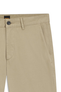 SIZE AND FIT The model wears a size 32/32 and is 6'0" tall with a, 31" chest, 26" waist and 35" hips. DETAILS Chino_slim - 50510933 Easy to style chinos by BOSS Menswear. Cut to a slim fit, this pair is crafted in soft satin with stretch for comfort. Slim fit Regular rise Button and zip closure Slim leg Pockets bottom front: French pocket Pockets bottom back: Welt pocket Unlined QUALITY & CARE INSTRUCTIONS Reduced Dry Clean Do Not Bleach Do Not Tumble Dry Iron Low Heat Quality: 97% Cotton, 3% Elastane Machine Wash Cold Gentle