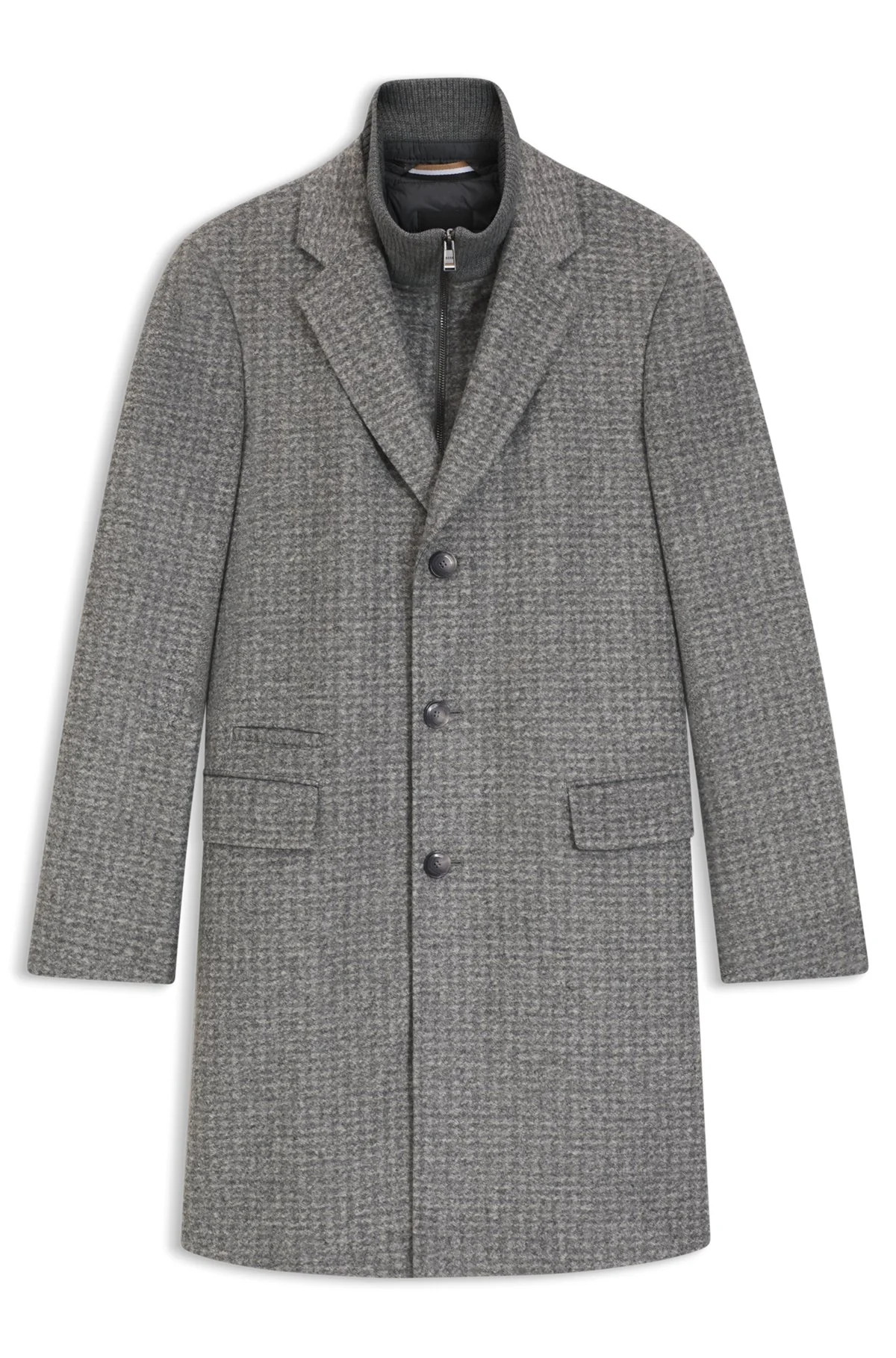 SIZE AND FIT The model wears a size 38R and is 6'1" tall with a, 36" chest, 29" waist and 37" hips. DETAILS Blended with soft wool, this patterned BOSS Menswear coat offers a versatile trans-seasonal option. Slightly padded with stretch for comfort. Detachable zip-up inner. Slim fit Stand collar Notched lapels Fastening top: Zip and button closure Number of buttons: 3 Pockets top: Flap pockets Back vent Fully lined H-Hyde-J-Bib-Pad-254 - 50551612 QUALITY & CARE INSTRUCTIONS Quality: 45% Polyester, 40% Polyacrylic, 15% Virgin wool, Lining: 100% Polyamid, Knitwear: 50% Wool, 50% Polyacrylic, Body Lining: 100% Viscose, sleeve wadding: 100% Polyester (45% recycled), body wadding: 100% Polyester Do Not Bleach Do Not Wash Reduced Dry Clean Iron Low Heat Do Not Tumble Dry
