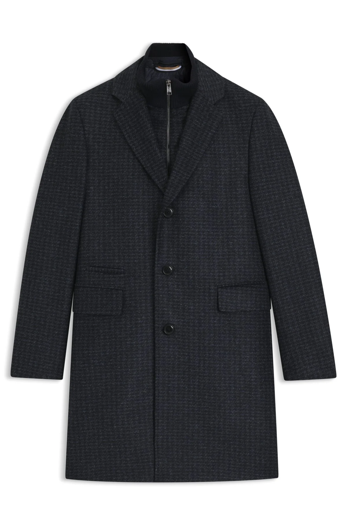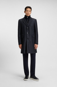 SIZE AND FIT The model wears a size 38R and is 6'1" tall with a, 36" chest, 29" waist and 36" hips. DETAILS Blended with soft wool, this patterned BOSS Menswear coat offers a versatile trans-seasonal option. Slightly padded with stretch for comfort. Detachable zip-up inner. Slim fit Stand collar Notched lapels Fastening top: Zip and button closure Number of buttons: 3 Pockets top: Flap pockets Back vent Fully lined H-Hyde-J-Bib-Pad-254 - 50551612 QUALITY & CARE INSTRUCTIONS Iron Low Heat Do Not Tumble Dry Material: 45% Polyester, 40% Polyacrylic, 15% Virgin wool, Lining: 100% Polyamid, Knitwear: 50% Wool, 50% Polyacrylic, Body Lining: 100% Viscose, sleeve wadding: 100% Polyester (45% recycled), body wadding: 100% Polyester Do Not Bleach Do Not Wash Reduced Dry Clean