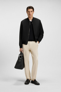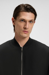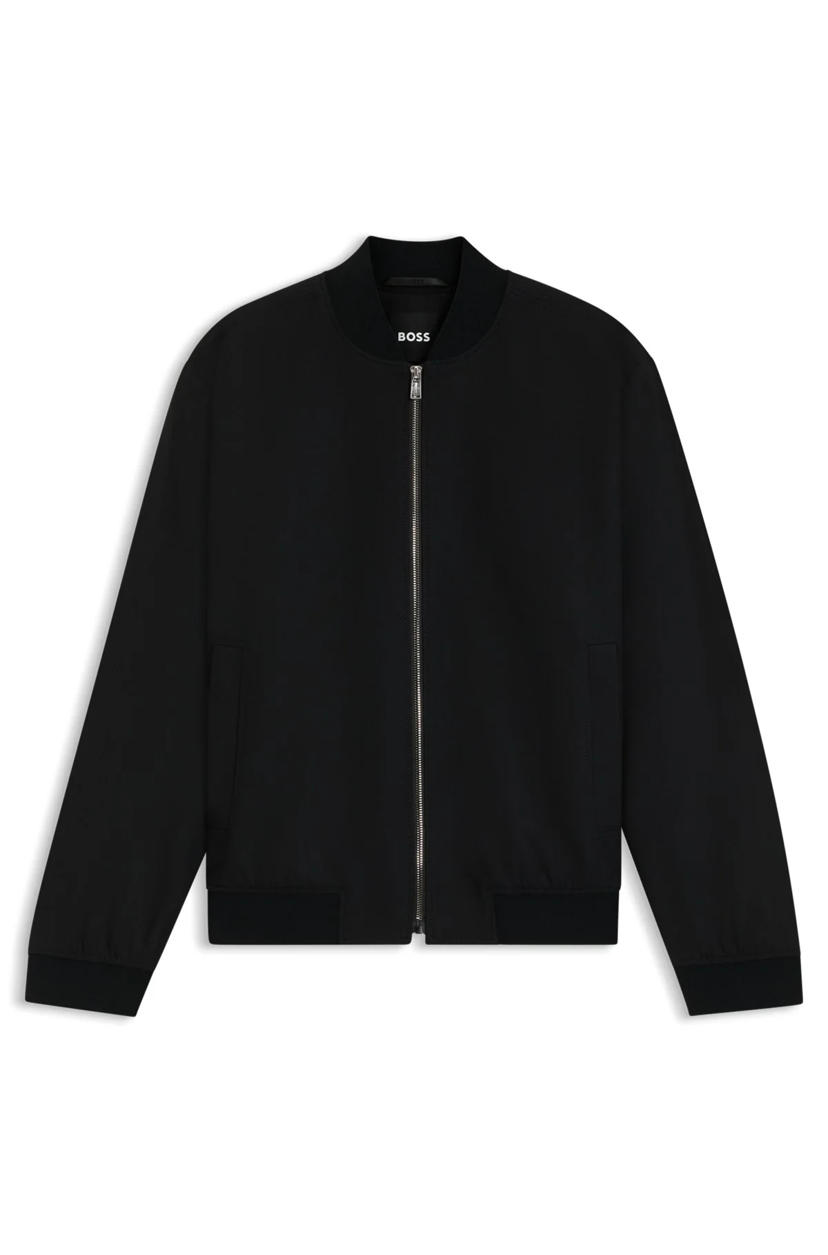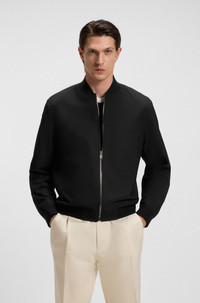 SIZE AND FIT The model wears a size 38R and is 6'1" tall with a, 33" chest, 27" waist and 33" hips. DETAILS P-Hanry-BMB-WG-253 - 50546057 Featuring a double-ended zip, this slim-fitting BOSS Menswear jacket has a blouson style. Washable stretch blend with wool. Subtle pattern. Slim fit Unlined QUALITY & CARE INSTRUCTIONS Iron Low Heat Do Not Tumble Dry Cold, gentle machine wash; reduced spin speed. Reduced Dry Clean Quality: 47% Polyester, 29% Wool, 20% Viscose, 4% Elastane, Cuff: 90% Polyester, 10% Elastane, Sleeve lining: 95% Polyester, 5% Elastane Do Not Bleach