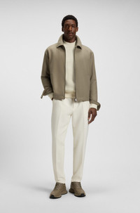 SIZE AND FIT The model wears a size 38R and is 6'1" tall with a, 36" chest, 29" waist and 37" hips. DETAILS Crafted with extra stretch for comfort, this slim-fit BOSS Menswear jacket is a contemporary take on a wardrobe essential. Two-way zip. Wing collar. Relaxed fit Fastening top: Zip closure Pockets top: Side slash pockets Button cuffs Fully lined C-Crow-Coach-254 - 50551512 QUALITY & CARE INSTRUCTIONS Iron Low Heat Do Not Tumble Dry Do Not Bleach Do Not Wash Reduced Dry Clean Material: 68% Polyester, 28% Viscose, 4% Elastane, Lining: 100% Viscose, Sleeve lining: 100% Viscose