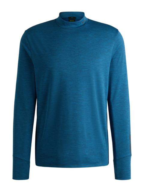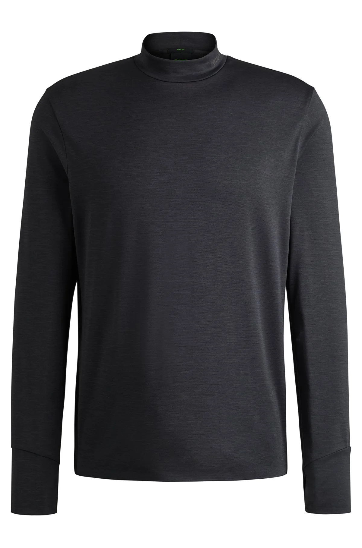 SIZE AND FIT The model wears a size M and is 6'2" tall with a, 37" chest, 28" waist and 37" hips. DETAILS Tock Active - 50525232 A long-sleeved T-shirt by BOSS, with a branded collar. This slim-fit top features moisture management, temperature regulation and bonded seams for active comfort. Slim fit Neckline: Mock Neck Long sleeves Standard length QUALITY & CARE INSTRUCTIONS Iron Low Heat Machine Wash Cold Gentle Do Not Bleach Do Not Tumble Dry Quality: 100% Polyester, Back panel: 100% Polyester Do Not Dry Clean