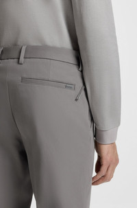 DETAILS P-Kaiton1-Zip - 50543945 Upgrade your off-duty foundations with the stretch twill of these BOSS Menswear trousers. Cut to a slim fit with a regular rise. Slim fit Regular rise Button and zip closure Pockets bottom front: Zip pockets Pockets bottom back: Welt pocket QUALITY & CARE INSTRUCTIONS Do Not Tumble Dry Machine Wash Cold Gentle Quality: 60% Cotton, 33% Polyamide, 7% Elastane Reduced Dry Clean Iron Low Heat Do Not Bleach