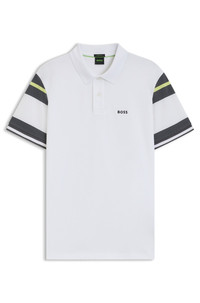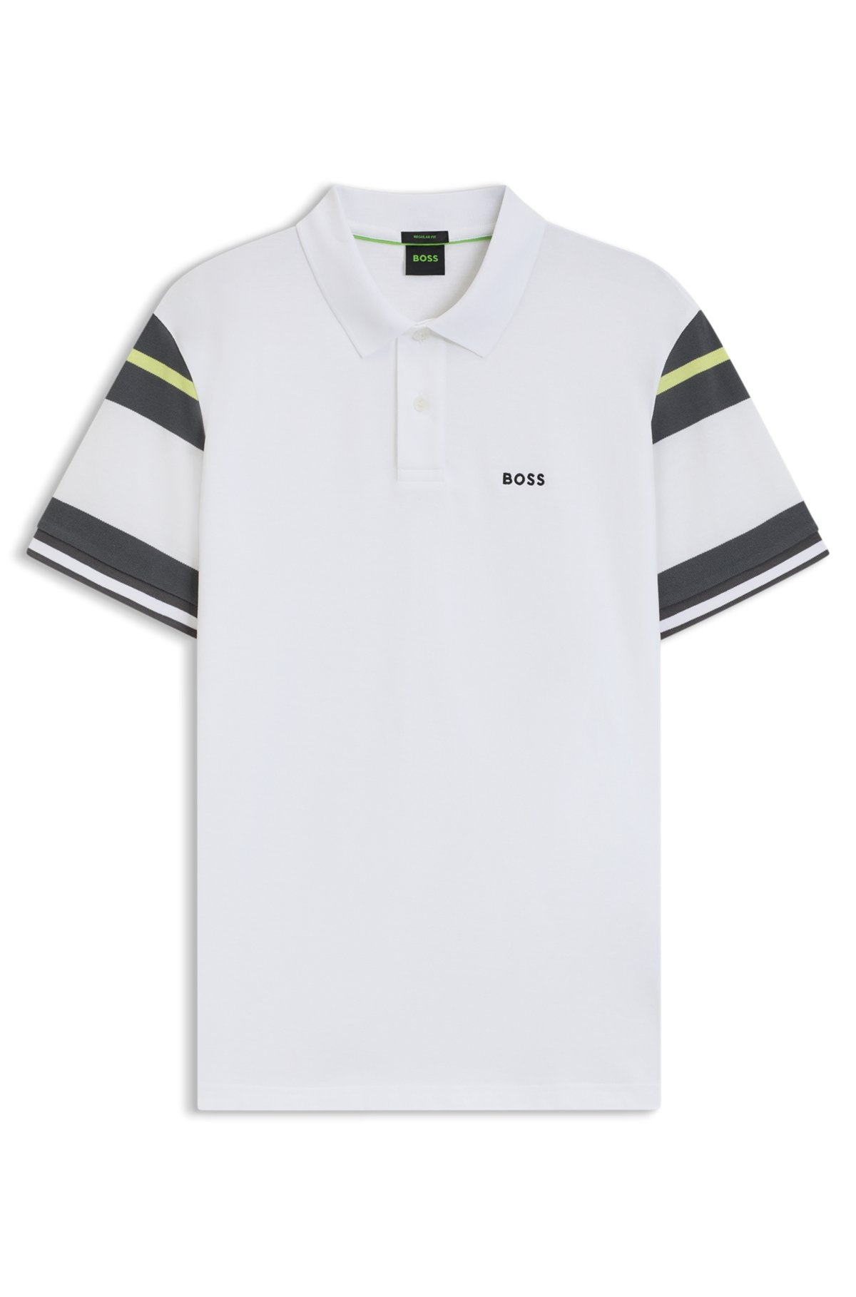 SIZE AND FIT The model wears a size M and is 6'0" tall with a, 38" chest, 29" waist and 38" hips. DETAILS Polo Sleeve Zone - 50544476 Cut to a regular fit in breathable cotton pique, this BOSS Menswear polo shirt has creative block stripes on the sleeves. Logo detail. Regular fit Neckline: Flat-knit collar Number of buttons: 2 Short sleeves Flat-knit cuffs Standard length QUALITY & CARE INSTRUCTIONS Do Not Tumble Dry Do Not Bleach Do Not Dry Clean Quality: 100% Cotton Machine Wash Cold Gentle Iron Low Heat