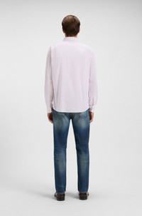 DETAILS H-ROAN-BD-E-C1-253 - 50545235 With a clean stripe punctuated by a Double B monogram, this slim BOSS Menswear shirt strikes a fresh casual note. satin with stretch. Slim fit Button-down collar Round cuffs QUALITY & CARE INSTRUCTIONS Quality: 72% Cotton, 24% Polyamid, 4% Elastane Do Not Tumble Dry Iron Low Heat Machine Wash Warm Gentle Do Not Bleach Dry Clean Only