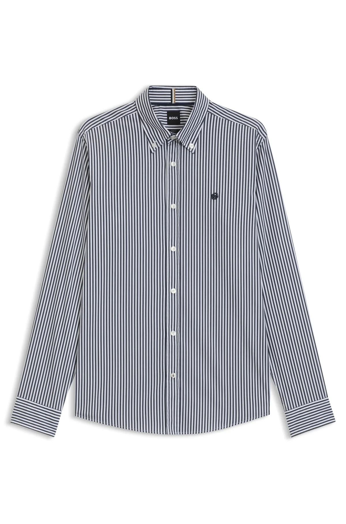 SIZE AND FIT The model wears a size M and is 6'1" tall with a, 33" chest, 24" waist and 36" hips. DETAILS H-ROAN-BD-E-C1-253 - 50545235 With a clean stripe punctuated by a Double B monogram, this slim BOSS Menswear shirt strikes a fresh casual note. satin with stretch. Slim fit Button-down collar Round cuffs QUALITY & CARE INSTRUCTIONS Quality: 72% Cotton, 24% Polyamid, 4% Elastane Machine Wash Warm Gentle Iron Low Heat Do Not Tumble Dry Do Not Bleach Dry Clean Only