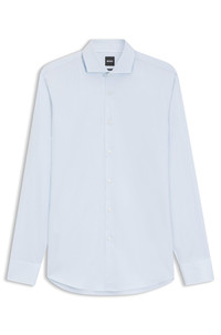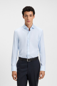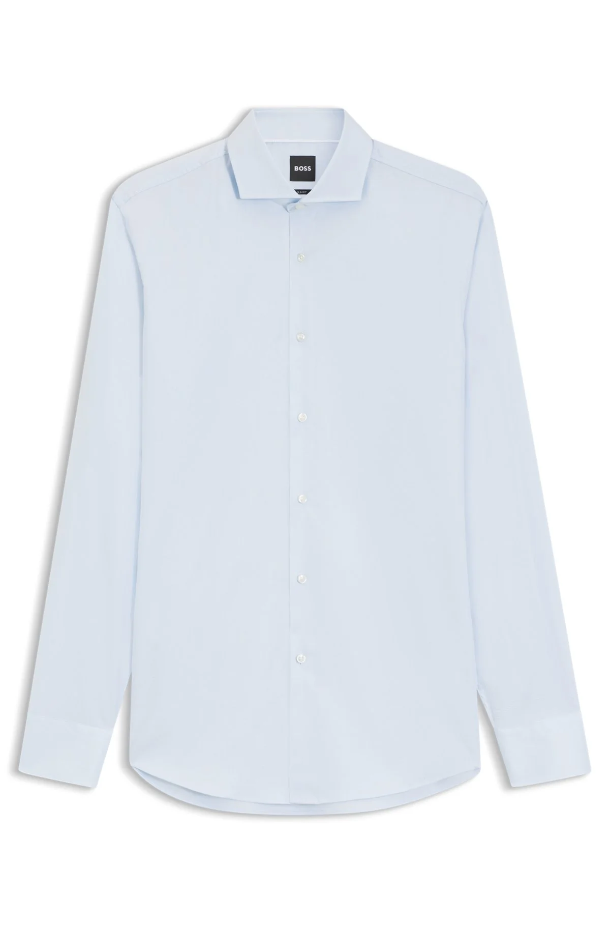 SIZE AND FIT The model wears a size 15.5 and is 6'1" tall with a, 33" chest, 24" waist and 36" hips. DETAILS H-HANK-spread-C1-222 - 50539203 Woven with a contemporary structure, this BOSS Menswear business shirt is easy to style. Tailored to a clean fit with a spread collar. This product’s raw material is derived from regenerative agriculture: an approach focused on preservation and restoration that aims to increase biodiversity, preserve water quality and improve soil health while absorbing CO2. Regenerative agriculture also promotes animal welfare and fair working conditions for farmers. Slim fit Spread collar Round cuffs QUALITY & CARE INSTRUCTIONS Do Not Bleach Do Not Tumble Dry Quality: 53% Cotton, 47% Lyocell Iron Medium Heat Dry Clean Only Machine Wash Warm