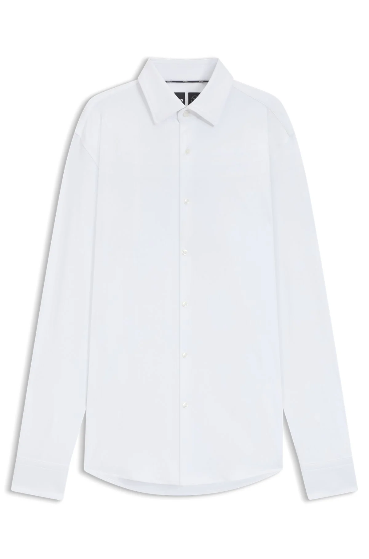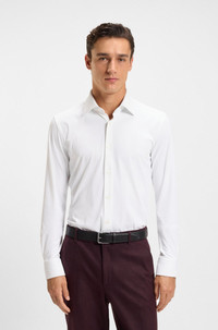 SIZE AND FIT The model wears a size EU:40 and is 6'1" tall with a, 37" chest, 29" waist and 35" hips. DETAILS With generous stretch for comfort in movement, this BOSS Menswear shirt is a modern business option. Slim fit in brushed flannel with a fine rib. Slim fit Kentkragen Round cuffs P-HANK-kent-C1-222 - 50550068 QUALITY & CARE INSTRUCTIONS Do Not Bleach Dry Clean Only Machine Wash Cold Gentle Do Not Tumble Dry Material: 79% Polyamid, 21% Elastane Iron Low Heat