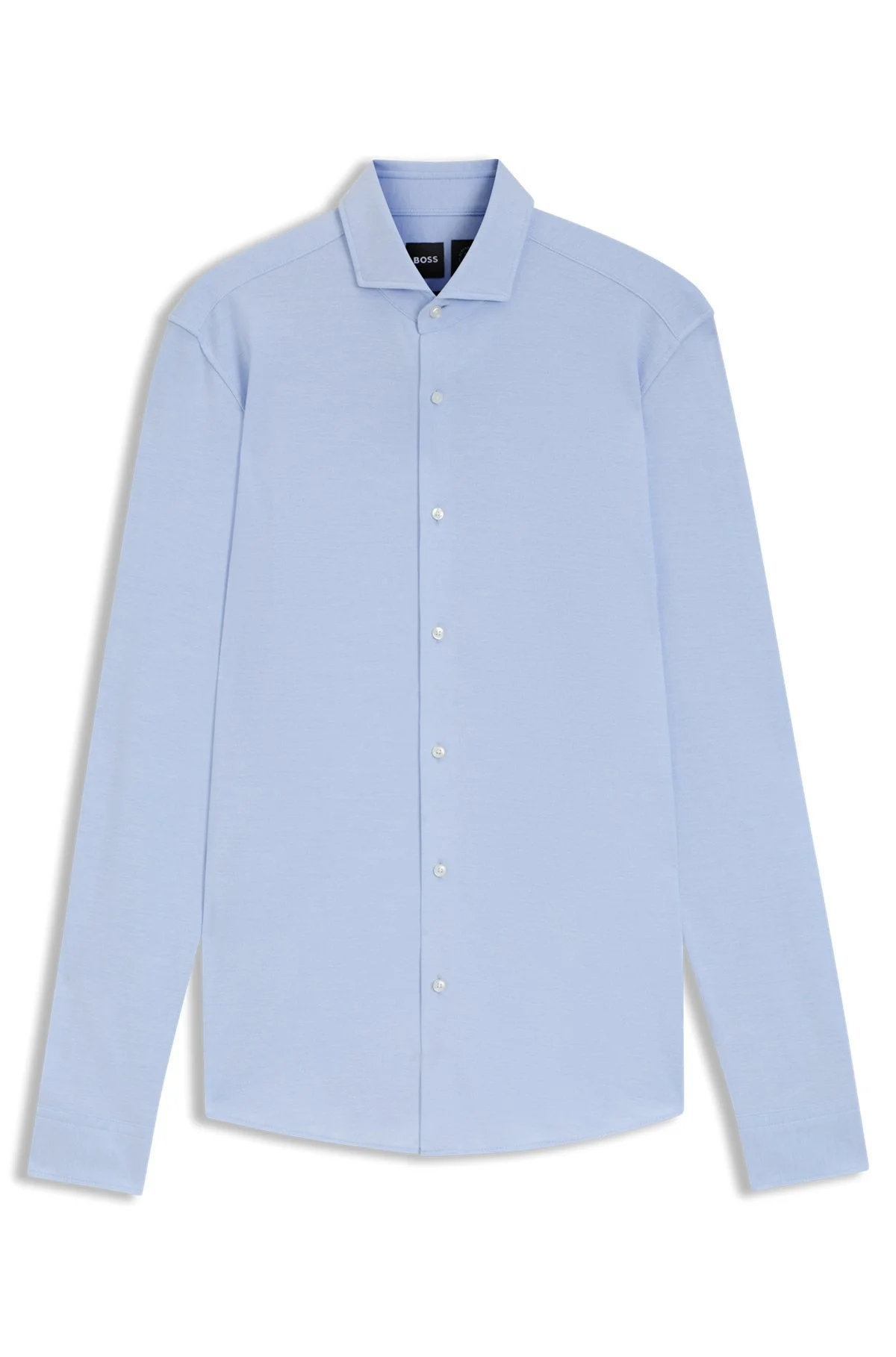 SIZE AND FIT The model wears a size 15.5 and is 6'2" tall with a, 37" chest, 30" waist and 37" hips. DETAILS P-HANK-spread-243 - 50527675 A versatile shirt cut to a streamlined fit by BOSS. This piece is crafted in breathable cotton jersey with a pique weave. Slim fit Spread collar Round cuffs QUALITY & CARE INSTRUCTIONS Do Not Bleach Do Not Tumble Dry Dry Clean Only Quality: 100% Cotton Iron Low Heat Machine Wash Cold Gentle