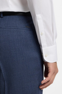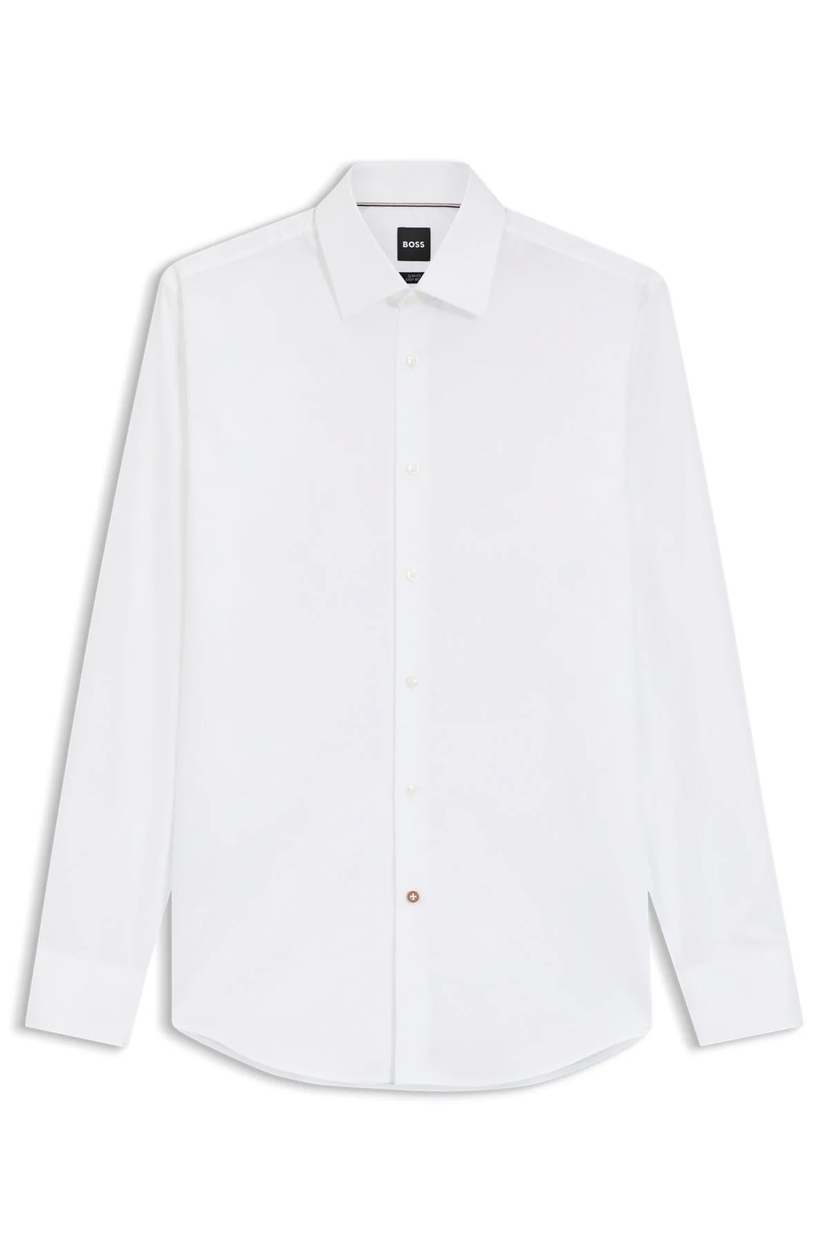 SIZE AND FIT The model wears a size 15.7 and is 6'2" tall with a, 36" chest, 28" waist and 37" hips. DETAILS H-HANK-kent-C1-214 - 50479922 An adaptable shirt by BOSS Menswear, detailed with a signature stripe at the inner collar. Treated with an easy-iron finish for low-maintenance care and a super-soft feel against the skin, this long-sleeved shirt is tailored to a streamlined fit in pure-cotton poplin made in Austria. The white colorway is created with an eco-friendly process, offering color brilliance that is enhanced wash after wash. Slim fit Kent collar Round cuffs QUALITY & CARE INSTRUCTIONS Quality: 100% Cotton Iron Medium Heat Dry Clean Only Do Not Tumble Dry Do Not Bleach Machine Wash Warm