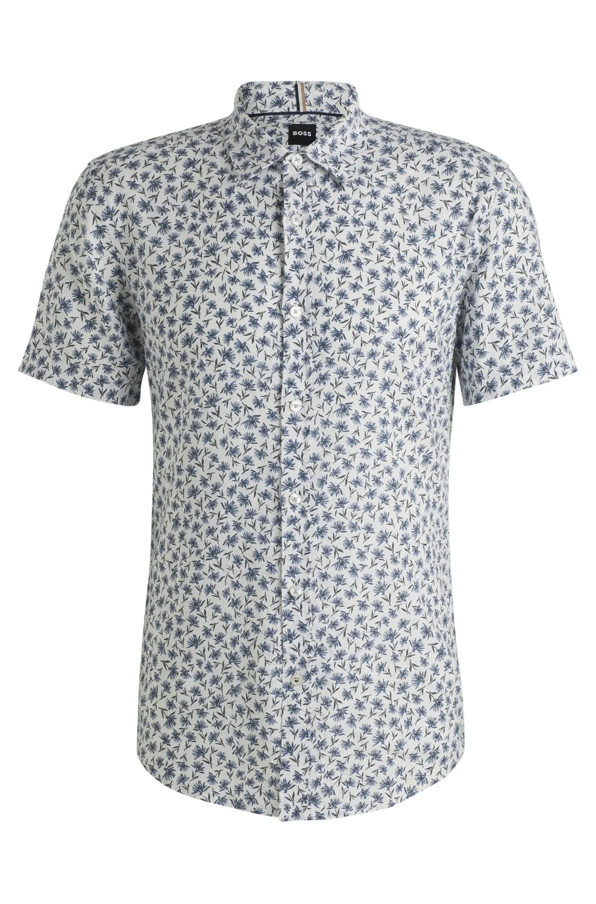 SIZE AND FIT The model wears a size M and is 6'1" tall with a, 33" chest, 31" waist and 33" hips. DETAILS C-ROAN-ken-SH-C1-251 - 50539565 A refined summery option, this BOSS Menswear shirt is crafted in cooling linen with stretch for comfort. Printed with a contemporary floral motif. Slim fit. Slim fit Kent collar Round cuffs QUALITY & CARE INSTRUCTIONS Dry Clean Only Do Not Tumble Dry Machine Wash Cold Do Not Bleach Quality: 85% Linen, 15% Elastomultiester Iron Low Heat