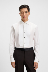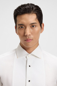 SIZE AND FIT The model wears a size EU:40 and is 6'1" tall with a, 36" chest, 29" waist and 36" hips. DETAILS In crisp Italian-made cotton poplin, this slim BOSS Menswear dress shirt is a refined choice. Special shank buttons and contrast plastron detail. Slim fit Spread collar Double cuffs Standard length L-HAYS-TUXSPREAD-254 - 50550334 QUALITY & CARE INSTRUCTIONS Dry Clean Only Do Not Tumble Dry Machine Wash Warm Do Not Bleach Iron Medium Heat Quality: 100% Cotton