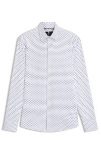 DETAILS P-HANK-kent-C1-222 - 50545310 In breathable Italian-made fabric with generous stretch, this BOSS Menswear shirt is a must on busy days. Slim fit. Contemporary print. Slim fit Kent collar Round cuffs QUALITY & CARE INSTRUCTIONS Do Not Tumble Dry Do Not Bleach Dry Clean Only Quality: 87% Polyamide, 13% Elastane Machine Wash Cold Gentle Iron Low Heat