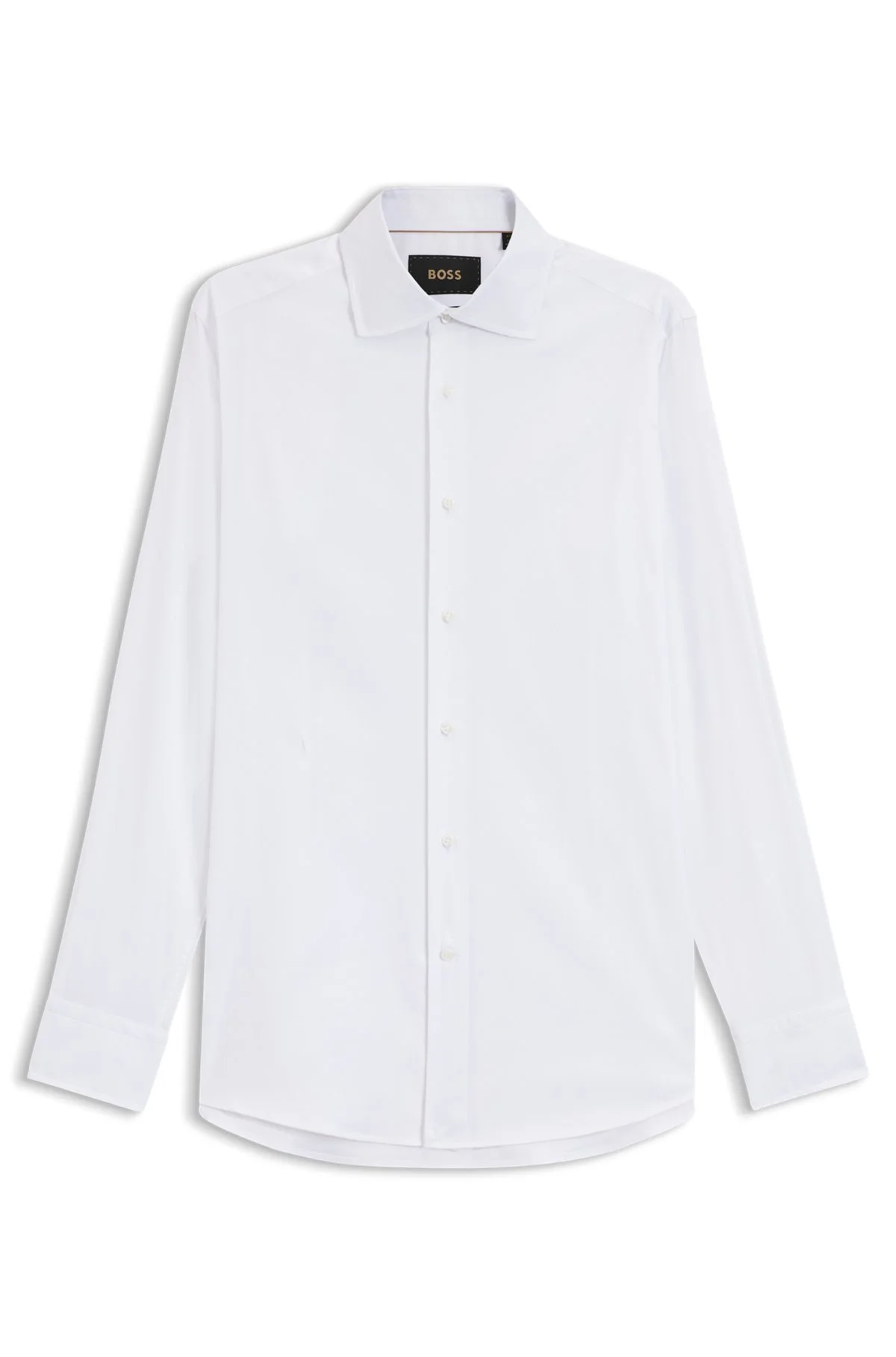 SIZE AND FIT The model wears a size EU:40 and is 6'1" tall with a, 36" chest, 29" waist and 36" hips. DETAILS Offering welcome stretch for traveling, this BOSS Menswear shirt is cut in soft Italian fabric. Slim fit. Mother-of-pearl buttons. Angled cuffs. Slim fit Spread collar L-HAYS-SPREAD-C1-243 - 50550267 QUALITY & CARE INSTRUCTIONS Do Not Bleach Machine Wash Warm Do Not Tumble Dry Dry Clean Only Material: 76% Cotton, 21% Polyamid, 3% Elastane Iron Medium Heat