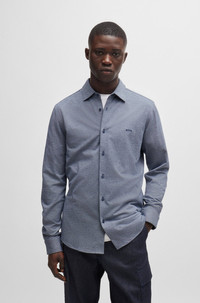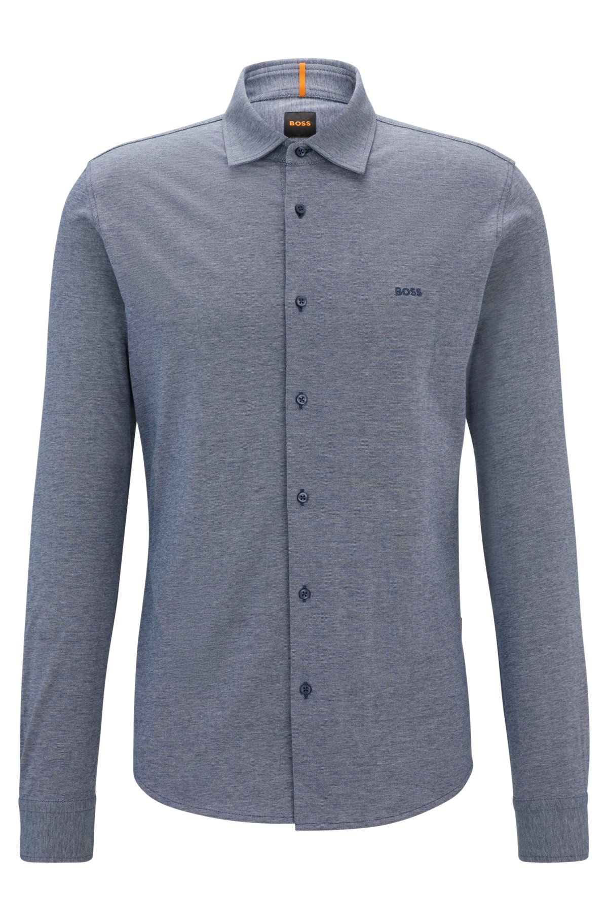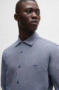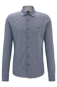 SIZE AND FIT The model wears a size M and is 6'0" tall with a, 31" chest, 26" waist and 35" hips. DETAILS Mysoft_2_M - 50519748 A clean and contemporary shirt in a defined fit by BOSS. This casual piece is crafted in melange pique jersey with an embroidered logo. Slim fit Spread collar Patch chest pockets Round cuffs Standard length QUALITY & CARE INSTRUCTIONS Do Not Dry Clean Iron Low Heat Do Not Bleach Do Not Tumble Dry Quality: 100% Cotton Machine Wash Cold Gentle