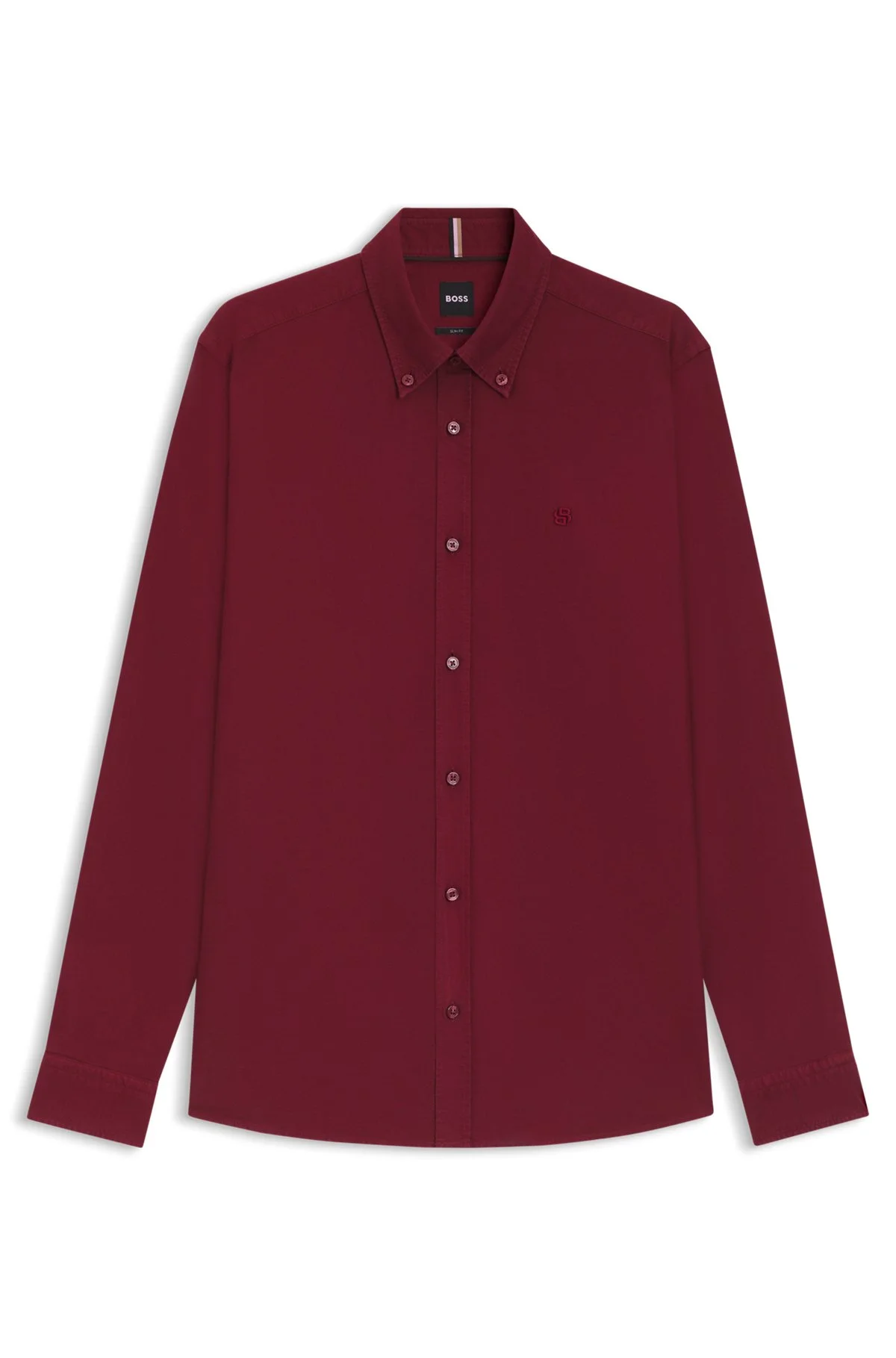 SIZE AND FIT The model wears a size L and is 6'1" tall with a, 36" chest, 29" waist and 37" hips. DETAILS In timeless Oxford cotton, this BOSS Menswear shirt is made to last. Defined fit with button-down collar. Distinctive Double B monogram embroidery. Slim fit Button-down collar Round cuffs H-ROAN-BD-E-C1-253 - 50544917 QUALITY & CARE INSTRUCTIONS Machine Wash Warm Do Not Tumble Dry Do Not Bleach Material: 100% Cotton Dry Clean Only Iron Medium Heat