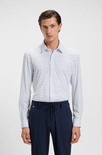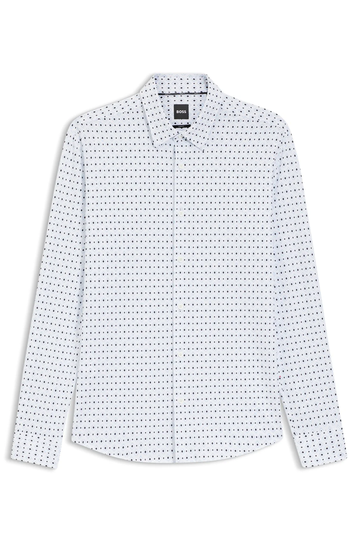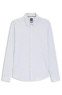 DETAILS Offering stretch comfort and moisture management, this BOSS Menswear shirt has a contemporary print. Italian fabric. Cut to a clean slim fit. Slim fit Kentkragen Round cuffs Standard length P-ROAN-kent-C1-233 - 50550734 QUALITY & CARE INSTRUCTIONS Dry Clean Only Quality: 87% Polyamide, 13% Elastane Do Not Bleach Machine Wash Cold Gentle Iron Low Heat Do Not Tumble Dry