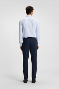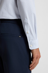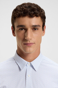 DETAILS Offering stretch comfort and moisture management, this BOSS Menswear shirt has a contemporary print. Italian fabric. Cut to a clean slim fit. Slim fit Kentkragen Round cuffs Standard length P-ROAN-kent-C1-233 - 50550734 QUALITY & CARE INSTRUCTIONS Machine Wash Cold Gentle Do Not Bleach Quality: 87% Polyamide, 13% Elastane Iron Low Heat Dry Clean Only Do Not Tumble Dry