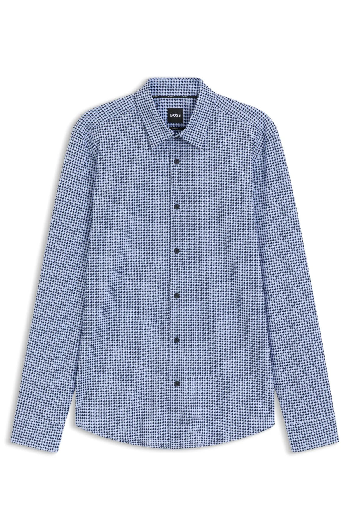 SIZE AND FIT The model wears a size M and is 6'1" tall with a, 32" chest, 28" waist and 34" hips. DETAILS P-ROAN-kent-C1-233 - 50545291 With its clean fit and modern print, this BOSS Menswear shirt is a strong choice for business styling. Crafted in jersey for comfort. Slim fit Kent collar Round cuffs QUALITY & CARE INSTRUCTIONS Do Not Bleach Do Not Tumble Dry Iron Low Heat Dry Clean Only Quality: 75% Cotton, 25% Polyester Machine Wash Cold Gentle