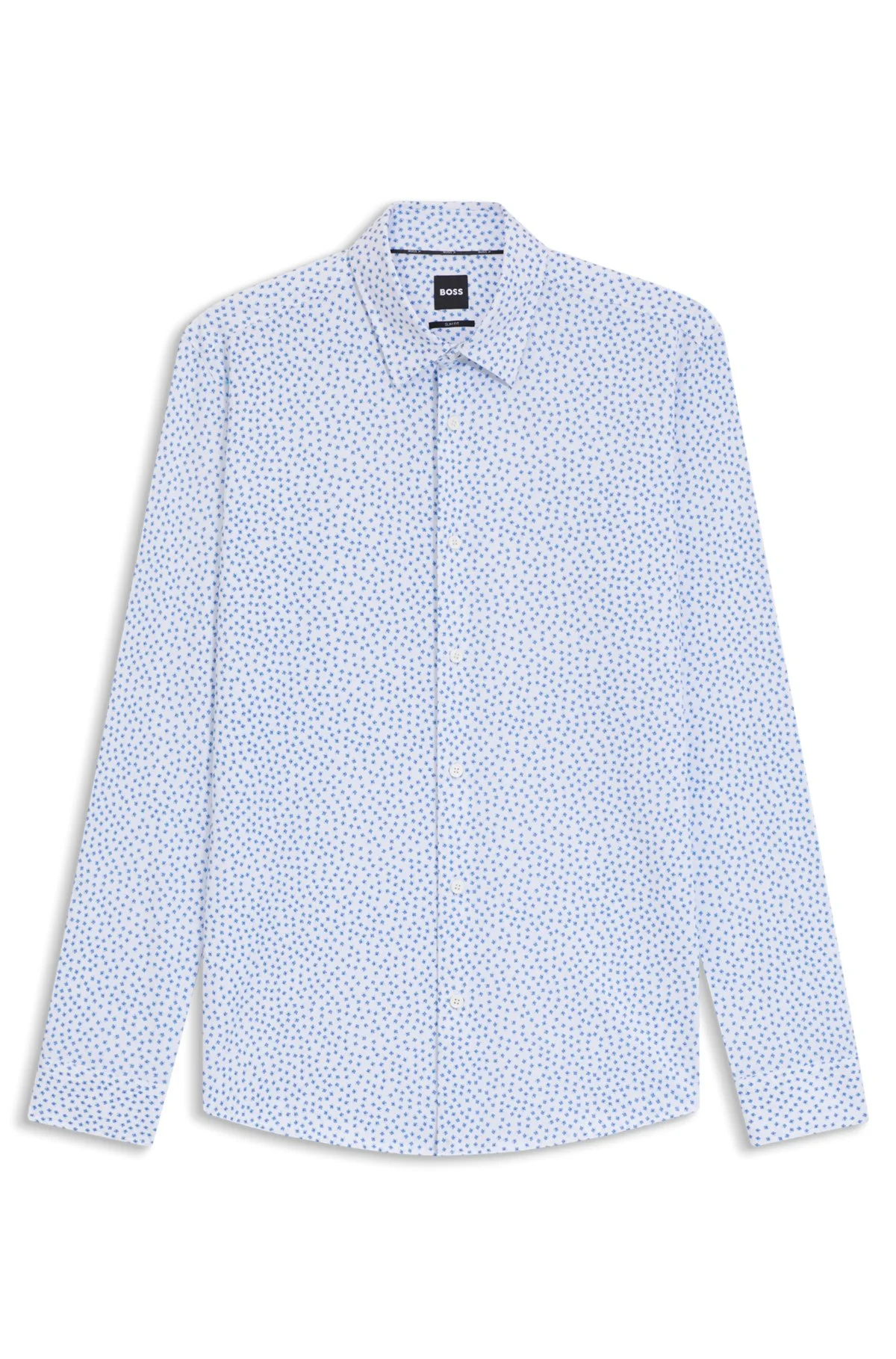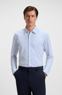 DETAILS P-ROAN-kent-C1-233 - 50545291 With its clean fit and modern print, this BOSS Menswear shirt is a strong choice for business styling. Crafted in jersey for comfort. Slim fit Kent collar Round cuffs QUALITY & CARE INSTRUCTIONS Machine Wash Cold Gentle Do Not Tumble Dry Do Not Bleach Quality: 75% Cotton, 25% Polyester Iron Low Heat Dry Clean Only