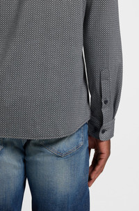 DETAILS Printed with a modern motif, this BOSS Menswear shirt is cut in flex-weave fabric with cotton for comfort and easy movement. Slim fit Slim fit Kentkragen Round cuffs Standard length P-ROAN-kent-C1-233 - 50550652 QUALITY & CARE INSTRUCTIONS Material: 50% Polyester, 45% Cotton, 5% Elastane Do Not Tumble Dry Do Not Bleach Dry Clean Only Iron Low Heat Machine Wash Cold Gentle