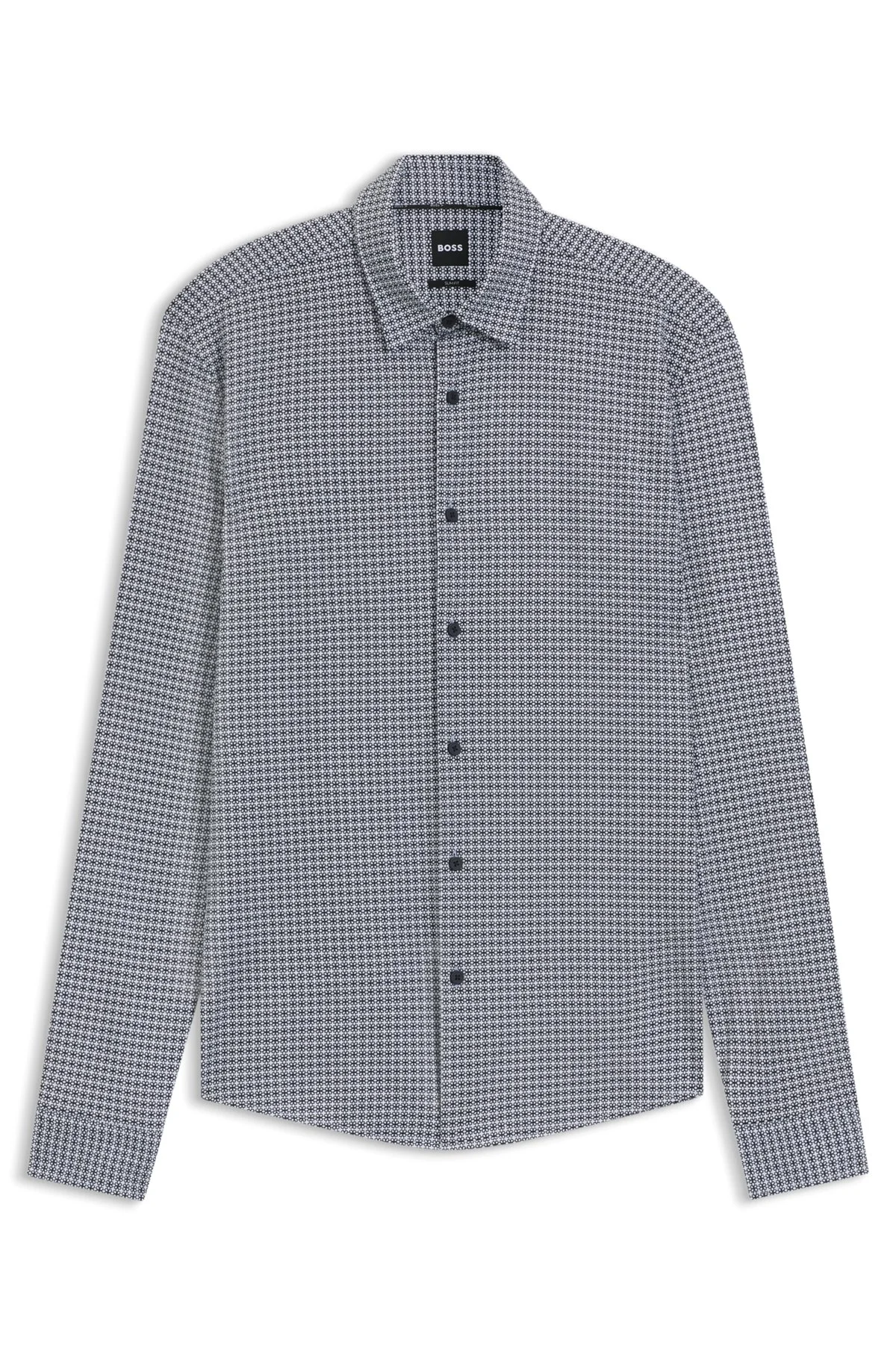 DETAILS P-ROAN-kent-C1-233 - 50550652 Printed with a modern motif, this BOSS Menswear shirt is cut in flex-weave fabric with cotton for comfort and easy movement. Slim fit Slim fit Kentkragen Round cuffs Standard length QUALITY & CARE INSTRUCTIONS Do Not Tumble Dry Machine Wash Cold Gentle Quality: 50% Polyester, 45% Cotton, 5% Elastane Iron Low Heat Do Not Bleach Dry Clean Only