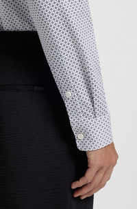 SIZE AND FIT The model wears a size M and is 6'1" tall with a, 36" chest, 29" waist and 36" hips. DETAILS In cotton-rich jersey for performance comfort, this BOSS Menswear shirt has a modern print that's easy to style. Contemporary slim fit. Slim fit Kentkragen Round cuffs Standard length P-ROAN-kent-C1-233 - 50550722 QUALITY & CARE INSTRUCTIONS Dry Clean Only Do Not Tumble Dry Iron Low Heat Machine Wash Cold Gentle Do Not Bleach Quality: 75% Cotton, 25% Polyester