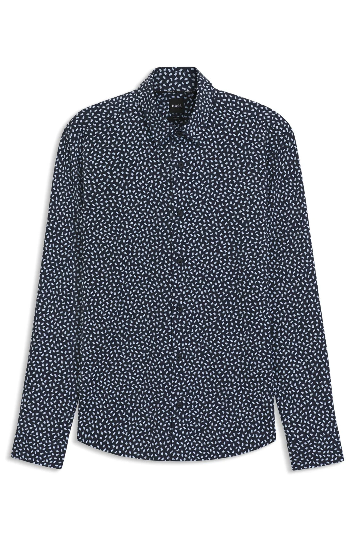 DETAILS P-ROAN-kent-C1-233 - 50545251 With advanced flexibility for comfort, this printed BOSS Menswear shirt combines dependable moisture management with breathability for a fresh feel. Modern slim fit. Italian jersey. Slim fit Kentkragen Round cuffs QUALITY & CARE INSTRUCTIONS Quality: 87% Polyamide, 13% Elastane Machine Wash Cold Gentle Do Not Tumble Dry Do Not Bleach Dry Clean Only Iron Low Heat