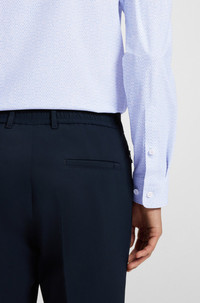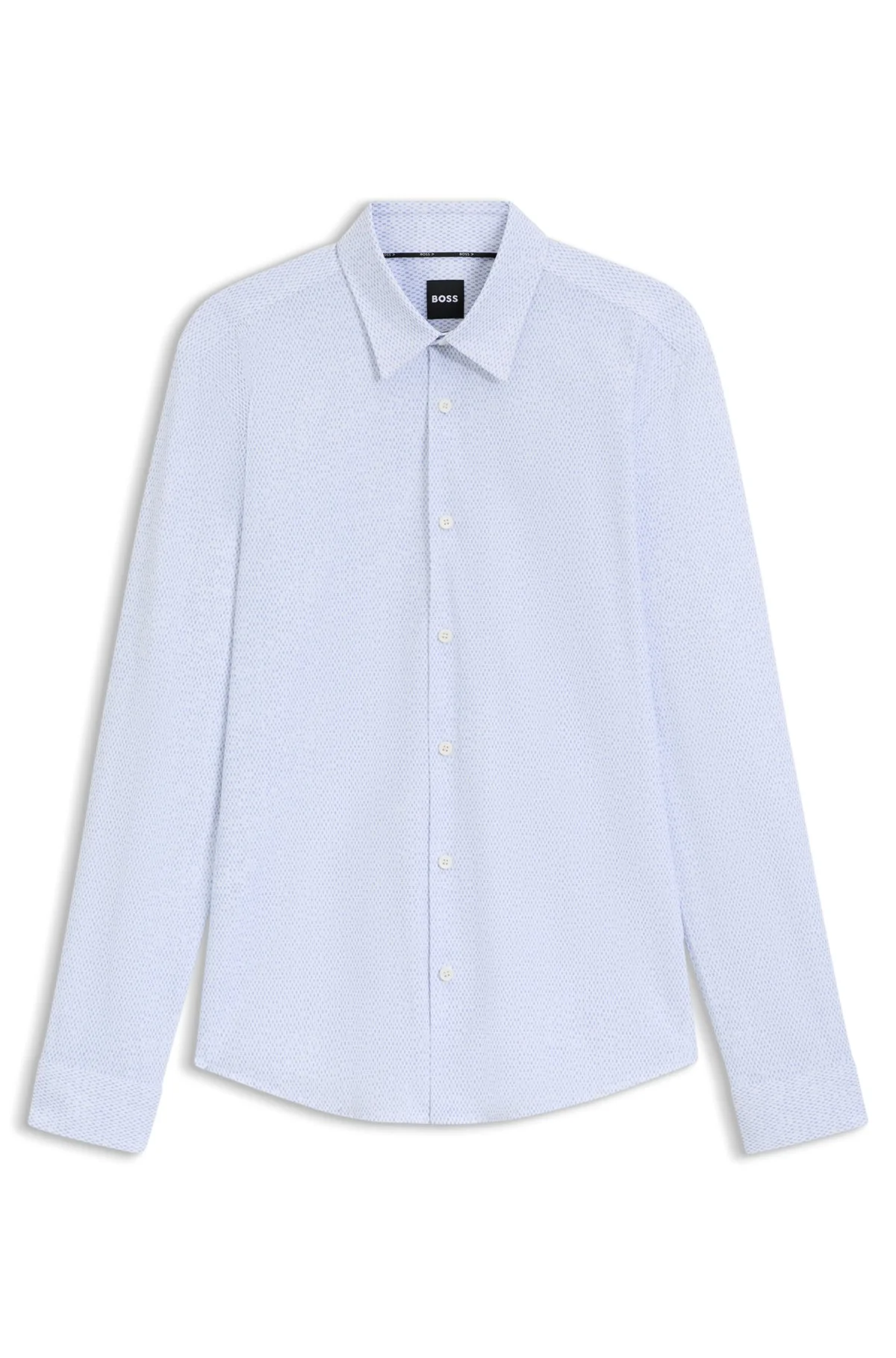 SIZE AND FIT The model wears a size M and is 6'1" tall with a, 36" chest, 29" waist and 36" hips. DETAILS P-ROAN-kent-C1-233 - 50545269 Engineered in performance-stretch jersey, this slim-cut BOSS Menswear shirt provides unbeatable comfort. Printed with a modern motif. Slim fit Kent collar Round cuffs QUALITY & CARE INSTRUCTIONS Do Not Bleach Dry Clean Only Do Not Tumble Dry Iron Low Heat Quality: 76% Polyamid, 24% Elastane Machine Wash Cold Gentle