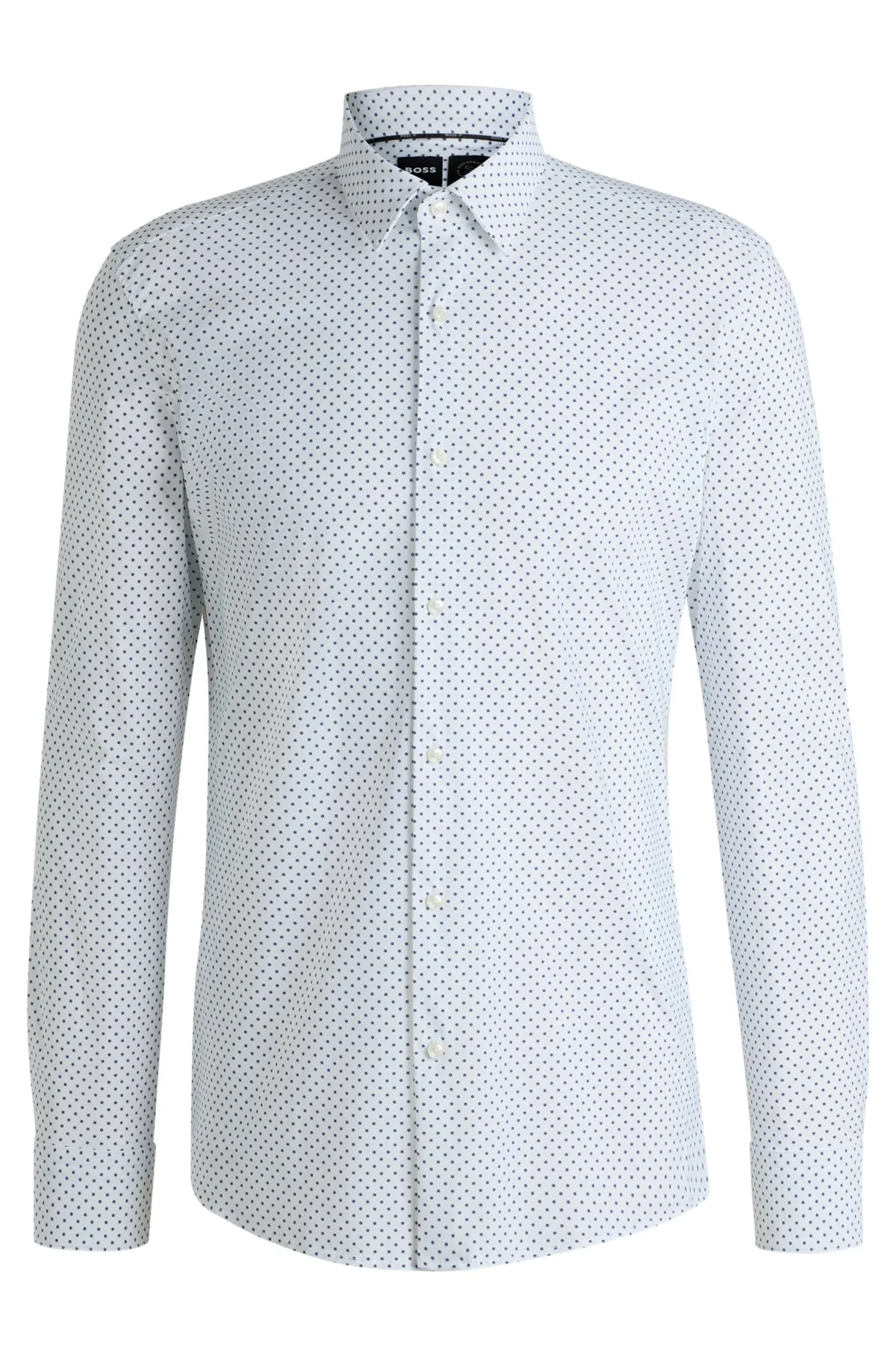SIZE AND FIT The model wears a size EU:40 and is 6'1" tall with a, 33" chest, 24" waist and 36" hips. DETAILS P-HANK-s-kent-C1-222 - 50539392 Stay comfortable on long days with the advanced flexibility of this BOSS Menswear shirt. Printed with a modern motif and tailored to a defined fit. Slim fit Kent collar Round cuffs QUALITY & CARE INSTRUCTIONS Do Not Bleach Do Not Tumble Dry Dry Clean Only Iron Low Heat Quality: 76% Polyamid, 24% Elastane Machine Wash Cold Gentle