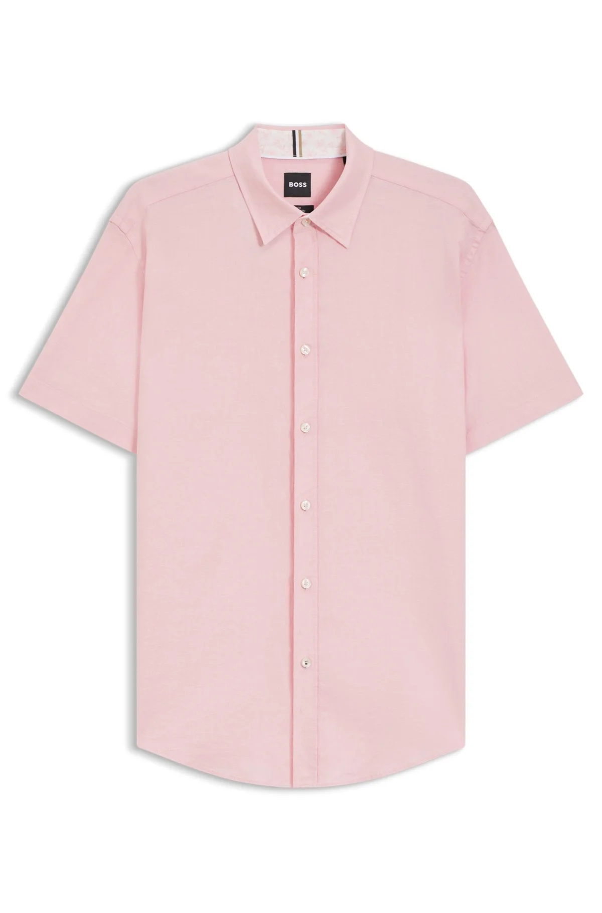 SIZE AND FIT The model wears a size L and is 6'2" tall with a, 36" chest, 28" waist and 37" hips. DETAILS C-ROAN-ken-SH-C3-252 - 50539569 With contrast material internally, this BOSS Menswear shirt is essential for the summer. Cut to a slim fit in a flexible linen blend. Slim fit Kent collar Round cuffs QUALITY & CARE INSTRUCTIONS Do Not Bleach Quality: 85% Linen, 15% Elastomultiester Machine Wash Cold Do Not Tumble Dry Iron Low Heat Dry Clean Only