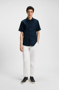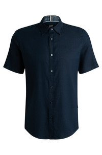 DETAILS C-ROAN-ken-SH-C3-252 - 50539569 With contrast material internally, this BOSS Menswear shirt is essential for the summer. Cut to a slim fit in a flexible linen blend. Slim fit Kent collar Round cuffs QUALITY & CARE INSTRUCTIONS Do Not Tumble Dry Do Not Bleach Quality: 85% Linen, 15% Elastomultiester Machine Wash Cold Dry Clean Only Iron Low Heat
