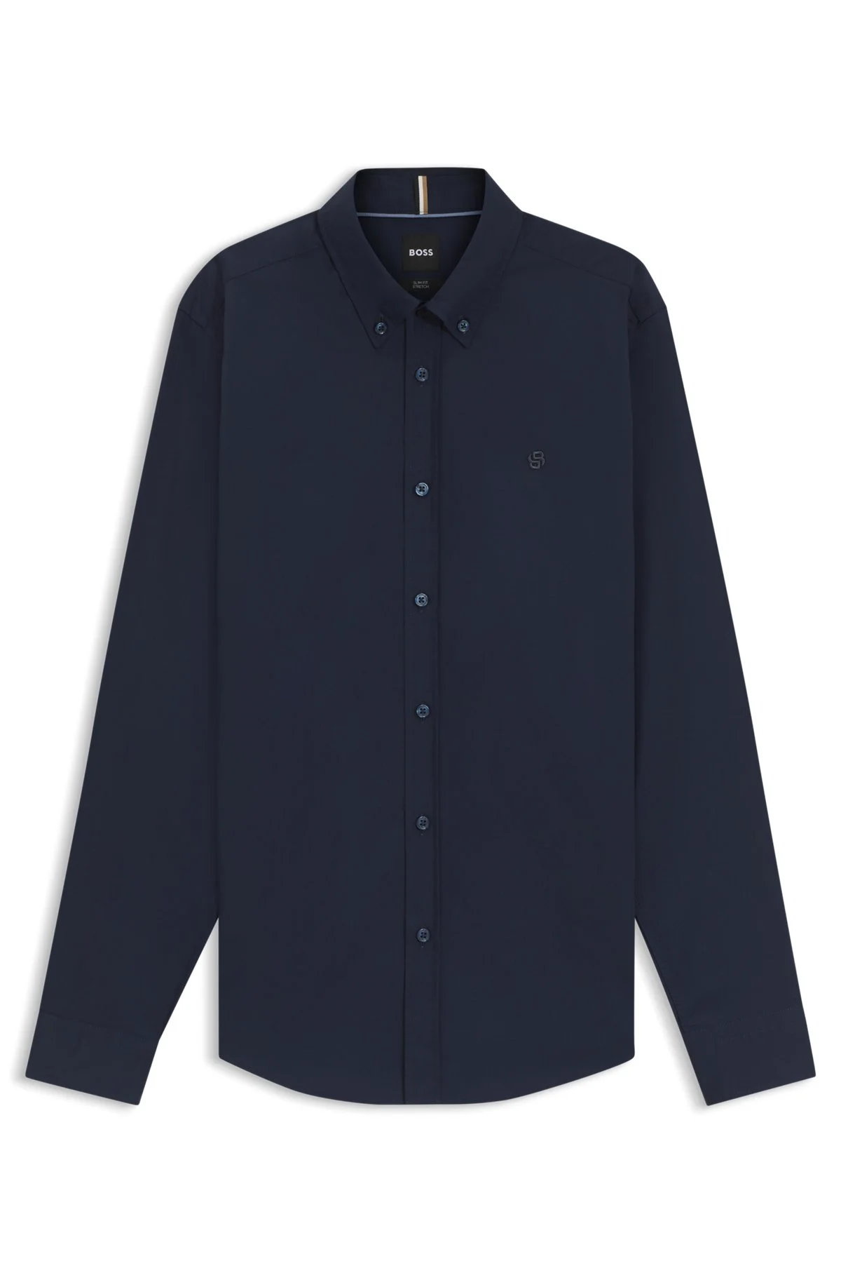 DETAILS With a Double B monogram, this BOSS Menswear business shirt is an instant classic. Cut to a slim fit in satin with stretch. Slim fit Button-down collar Round cuffs H-ROAN-BD-E-C1-253 - 50545234 QUALITY & CARE INSTRUCTIONS Dry Clean Only Iron Low Heat Do Not Tumble Dry Machine Wash Warm Gentle Do Not Bleach Material: 72% Cotton, 24% Polyamid, 4% Elastane