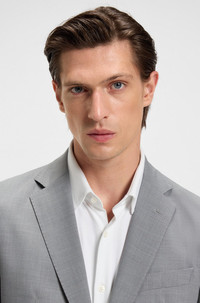 DETAILS P-Huge-2Pcs-WG-253 - 50546102 Create a range of formal looks with this easy-care BOSS Menswear suit. Offered in a slim fit for clean lines, this ensemble is crafted in washable fabric made with virgin wool and stretch for a soft feel with dependable crease resistance. The fabric is woven with a subtle pattern. Slim fit Notched lapels Number of buttons: 2 Jetted chest pockets Pockets top: Flap pockets Kissing buttons on the cuff Partially lined Pockets bottom front: Side slash pockets Pockets bottom back: Welt pocket Packaging: Dust bag QUALITY & CARE INSTRUCTIONS Do Not Bleach Quality: 52% Polyester, 43% Virgin wool, 5% Elastane, Lining: 95% Polyester, 5% Elastane, Sleeve lining: 95% Polyester, 5% Elastane, pocketing: 65% Polyester, 35% Cotton Reduced Dry Clean Do Not Tumble Dry Iron Low Heat Cold, gentle machine wash; reduced spin speed.