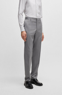 SIZE AND FIT The model wears a size 40L and is 6'2" tall with a, 37" chest, 29" waist and 37" hips. DETAILS H-Huge-2Pcs-224 - 50479561 An elegant two-piece suit by BOSS Menswear, featuring natural stretch for comfort in movement. Comprising a single-breasted jacket and slim-leg trousers, this suit is tailored to a streamlined fit for a clean and contemporary silhouette. Slim fit Notched lapels Number of buttons: 2 Welt chest pockets Pockets top: Flap pockets Button cuffs Side vent Fully lined Standard length Fit back length: 73 cm (29 inches) Pockets bottom front: French pocket Pockets bottom back: Welt pocket Fit foot width: 36,0 cm (14.2 inches) Packaging: Dust bag QUALITY & CARE INSTRUCTIONS Iron Low Heat Do Not Wash Quality: 100% Virgin wool, Lining: 65% Viscose, 35% Polyester, Sleeve lining: 100% Viscose, pocketing: 65% Polyester, 35% Cotton, knee lining: 100% Viscose Reduced Dry Clean Do Not Bleach Do Not Tumble Dry
