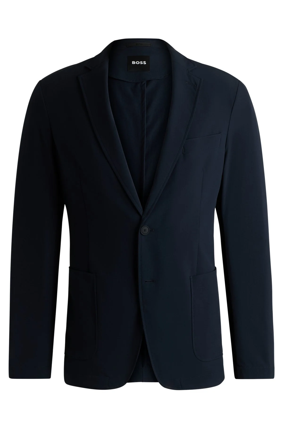 SIZE AND FIT The model wears a size EU:94 and is 6'1" tall with a, 33" chest, 24" waist and 36" hips. DETAILS P-Hanry-WG-251F - 50538635 Unconstructed and unlined for a clean drape, this slim-fitting BOSS Menswear suit jacket is great for travel. Machine-washable softshell fabric with generous stretch. QUALITY & CARE INSTRUCTIONS Iron Low Heat Quality: 88% Polyamide, 12% Elastane Do Not Bleach Cold, gentle machine wash; reduced spin speed. Do Not Tumble Dry Do Not Dry Clean