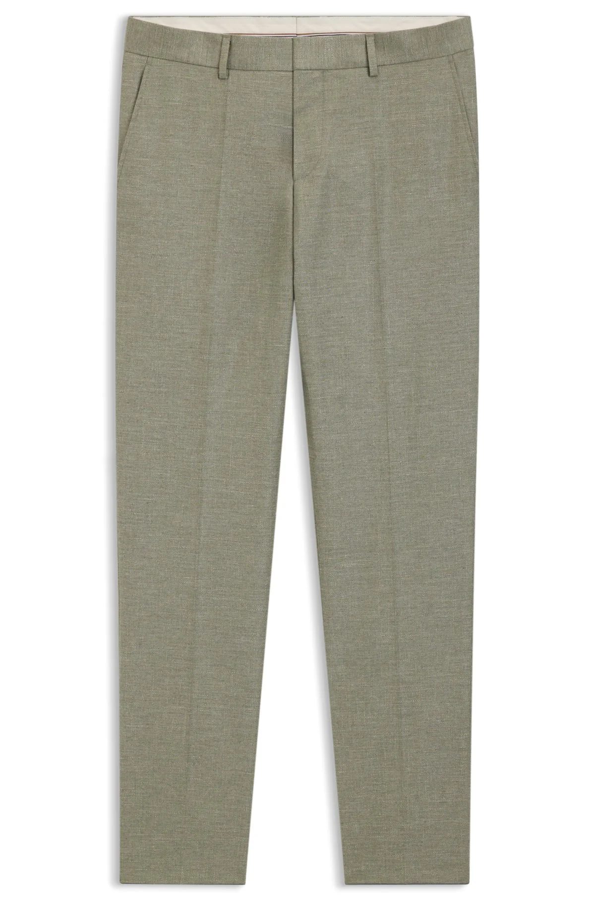 SIZE AND FIT The model wears a size 32R and is 6'1" tall with a, 36" chest, 29" waist and 36" hips. DETAILS H-Genius-253 - 50546003 With virgin wool, cotton and linen, these super-stretch BOSS Menswear trousers make a versatile building block. Cut to a clean slim fit. Slim fit Hook and zip closure Pockets bottom front: Side pockets Pockets bottom back: Welt pocket Partially lined QUALITY & CARE INSTRUCTIONS Do Not Tumble Dry Reduced Dry Clean Iron Low Heat Do Not Wash Do Not Bleach Quality: 35% Virgin wool, 30% Cotton, 26% Viscose, 7% Linen, 2% Elastane, pocketing: 65% Polyester, 35% Cotton, knee lining: 100% Viscose