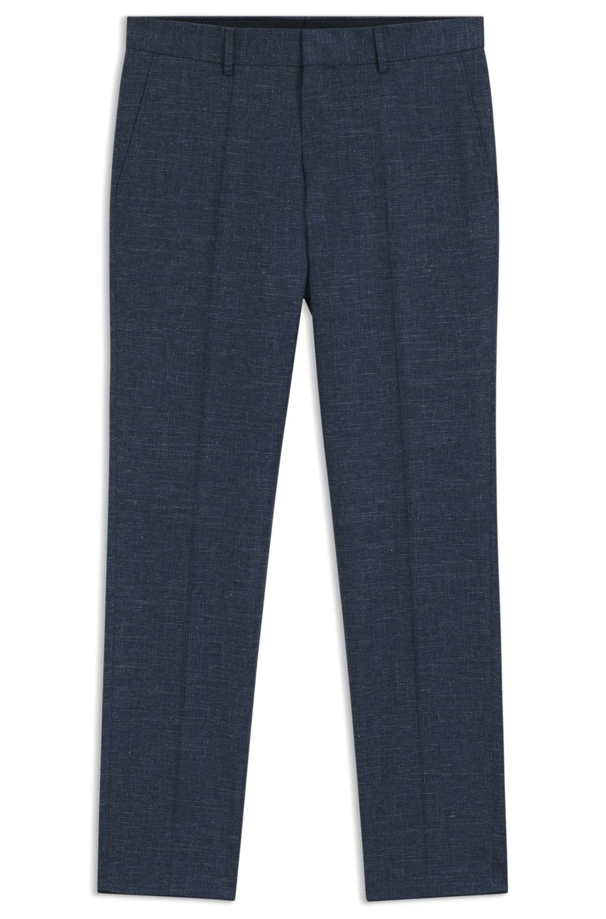 DETAILS H-Genius-253 - 50546003 With virgin wool, cotton and linen, these super-stretch BOSS Menswear trousers make a versatile building block. Cut to a clean slim fit. Slim fit Hook and zip closure Pockets bottom front: Side pockets Pockets bottom back: Welt pocket Partially lined QUALITY & CARE INSTRUCTIONS Iron Low Heat Do Not Tumble Dry Quality: 35% Virgin wool, 30% Cotton, 26% Viscose, 7% Linen, 2% Elastane, pocketing: 65% Polyester, 35% Cotton, knee lining: 100% Viscose Do Not Wash Reduced Dry Clean Do Not Bleach